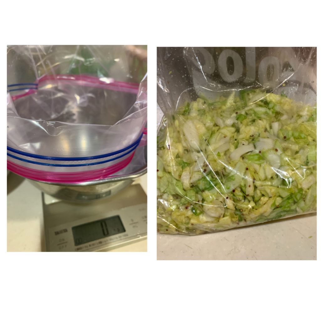 ② ジップロックに①のキャベツ、分量の梅酢、お好みで